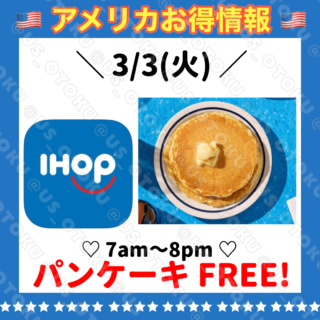 🔥 お得情報 3/3 iHopでパンケーキ無料 👇スワイプして詳細を確認してね♡ View this post on Instagram A post shared by エリー(お得さん)🇺🇸アメリカお得情報🉐 (@us_otoku) 👇🏻公式プロモーションページはこちら お得ちゃん ... 2026.03.01 🔥 お得情報フード/ドリンク