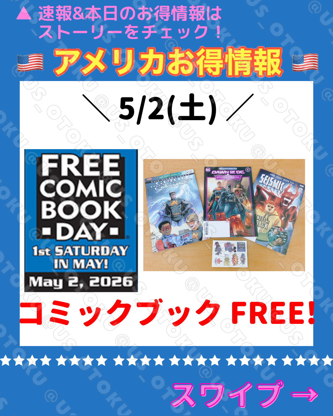 5/2 コミックストアでコミック無料 🔥 お得情報 X Facebook0 はてブ0 Pocket0 LINE コピー 2026.04.29 この記事は約1分で読めます。 アメリカお得情報 may earn a small commission via affiliate links in this post.当ブログはこの投稿に含まれるアフィリエイトリンクから少額の報酬を受け取ることがあります。 👇スワイプして詳細を確認してね♡ View this post on Instagram A post shared by エリー(お得さん)🇺🇸アメリカお得情報🉐 (@us_otoku) 👇🏻公式プロモーションページはこちら https://freecomicbookday.com お得ちゃん Happy Saving!